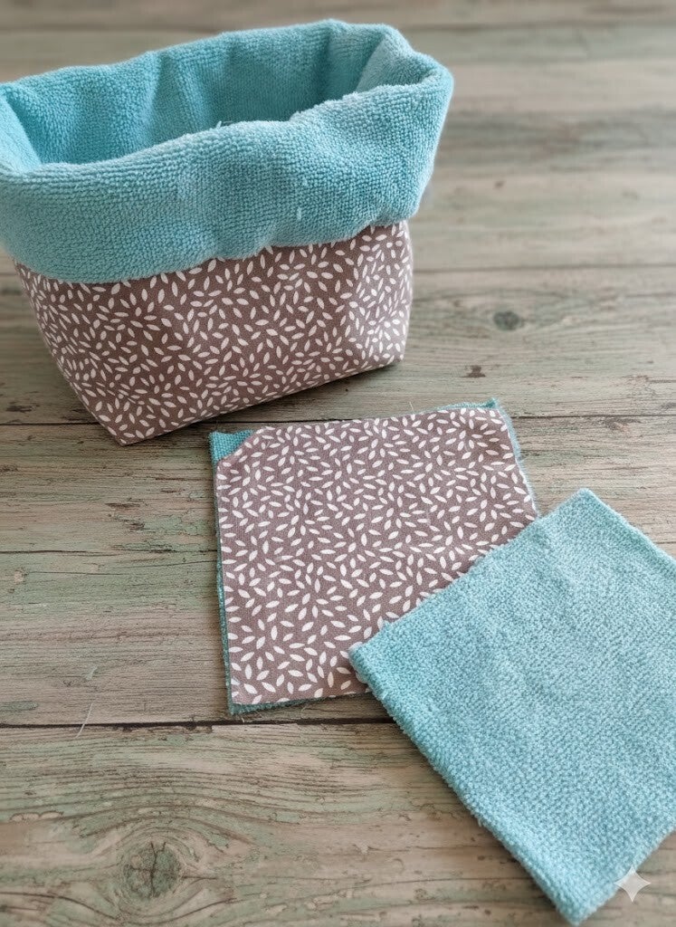 Ensemble lingettes réutilisables et son panier de rangement assorti.